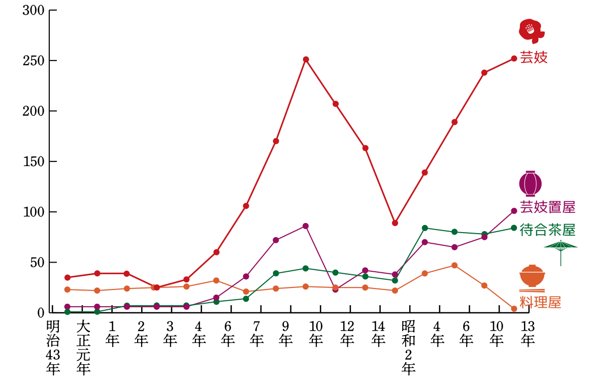 最盛期には252名もの芸妓が活躍していたといいます。
